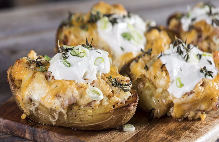- Κόβουμε το βούτυρο σε τέσσερα κομμάτια και βάζουμε ένα πάνω από κάθε πατάτα. Προσθέτουμε 30 γρ. τσένταρ, πιπέρι και βάζουμε στον φούρνο για 10-15 λεπτά.
