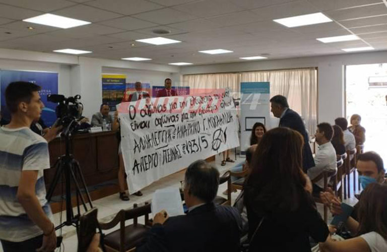 Δεκάδες άτομα, φορώντας καπέλα και γυαλιά ηλίου, «μπούκαραν» μέσα στην αίθουσα πετώντας τρικάκια και αναρτώντας πανό μπροστά από το βήμα των ομιλιτών, φωνάζοντας συνθήματα υπέρ της αποφυλάκισης του απεργού πείνας Γιάννη Μιχαηλίδη.