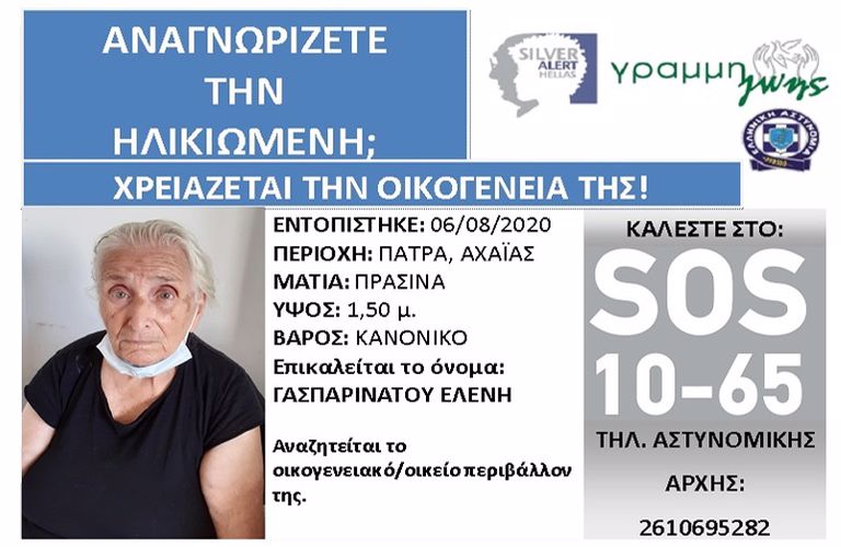 Για τον εντοπισμό του οικογενειακού της περιβάλλοντος έχει ενεργοποιηθεί Silver Alert Αγνώστων Στοιχείων.