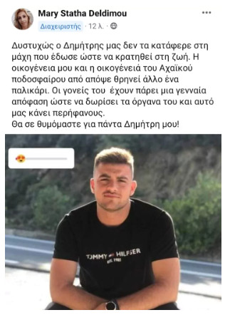 «Δυστυχώς ο Δημήτρης μας δεν τα κατάφερε στη μάχη που έδωσε ώστε να κρατηθεί στη ζωή. Η οικογένεια μου και η οικογένειά του Αχαϊκού ποδοσφαίρου από απόψε θρηνεί άλλο ένα παλικάρι. Οι γονείς του έχουν πάρει μια γενναία απόφαση ώστε να δωρίσει τα όργανα του και αυτό μας κάνει περήφανους. Θα σε θυμόμαστε για πάντα Δημήτρη μου!», έγραψε σε ανάρτηση της στο διαδίκτυο η θεία του 22χρονου.