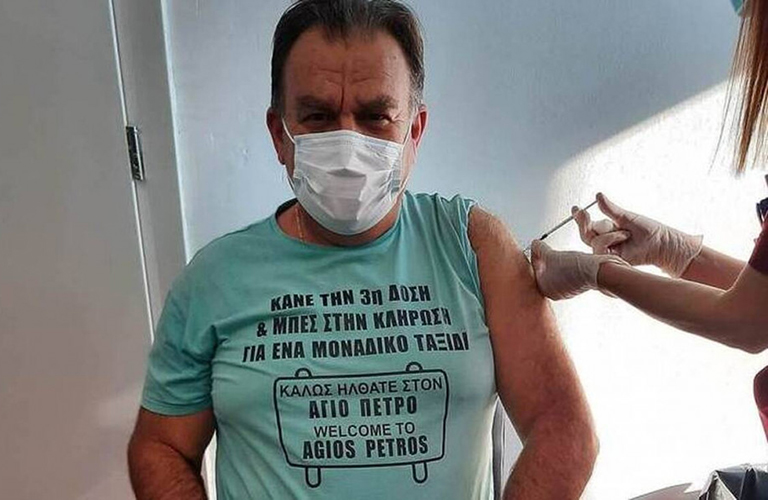 Όπως αποκαλύπτει το thebest.gr, ο συγκεκριμένος Πατρινός προσήλθε να κάνει την 3η δόση του εμβολίου με μπλουζάκι που έγραφε: