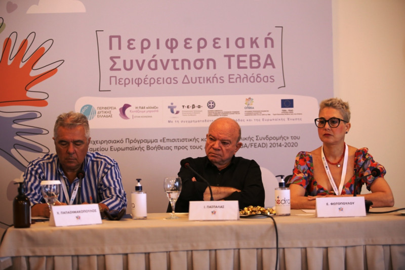 Από την μεριά του, ο Προϊστάμενος της γενικής Διεύθυνσης Δημόσιας Υγείας και Κοινωνικής Μέριμνας της ΠΔΕ, Χρήστος Παπασημακόπουλος, παρουσίασε το πρόγραμμα ΤΕΒΑ. Αναφερόμενος στην πορεία εξέλιξης του έργου, υποστήριξε ό,τι ο συνολικός αριθμός ωφελούμενων που παρέλαβαν Τρόφιμα στην Αχαΐα, αντιστοιχεί σε 24.848 και ο συνολικός αριθμός ωφελούμενων που παρέλαβαν ΒΥΣ, αντιστοιχεί σε 15.601. Στην Αιτωλοακαρνανία αντιστοιχεί σε 26.288 και ο συνολικός αριθμός ωφελούμενων που παρέλαβαν ΒΥΣ σε 21.457. Στην Ηλεία αντιστοιχεί σε 19.083 και ο συνολικός ωφελούμενων που παρέλαβαν ΒΥΣ σε 12.922.