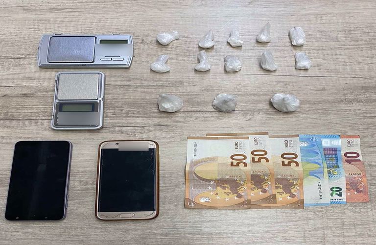Οι αστυνομικοί κατέσχεσαν 25 γραμμάρια κοκαΐνης, διαμοιρασμένα σε 13 συσκευασίες, δύο ηλεκτρονικές ζυγαριές ακριβείας