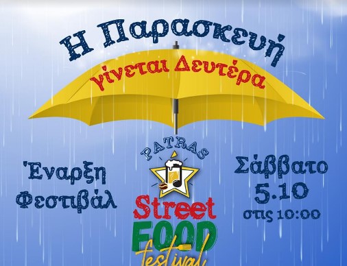 Tα καιρικά φαινόμενα που πλήττουν την Αχαΐα φέρνουν αλλαγές και στο πρόγραμμα του Patras Street Food Festival καθώς η πρώτη ημέρα των εκδηλώσεων (Παρασκευή 4 Οκτωβρίου) αναβάλλεται και τελικά η έναρξη θα γίνει το Σάββατο το πρωί στις 10.00.