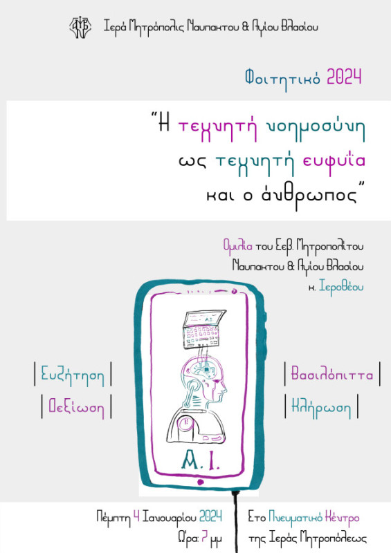 «Η τεχνητή νοημοσύνη ως τεχνητή ευφυΐα και ο άνθρωπος», προγραμματισμένη για σήμερα, Τρίτη 2 Ιανουαρίου 2024, μετατίθεται για την Πέμπτη 4 Ιανουαρίου 2024, στις 7 το απόγευμα στο Πνευματικό Κέντρο της Ιεράς Μητροπόλεως.