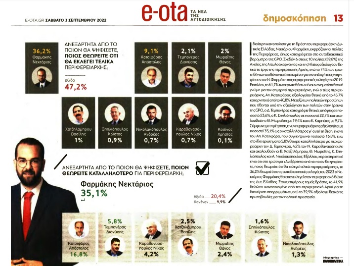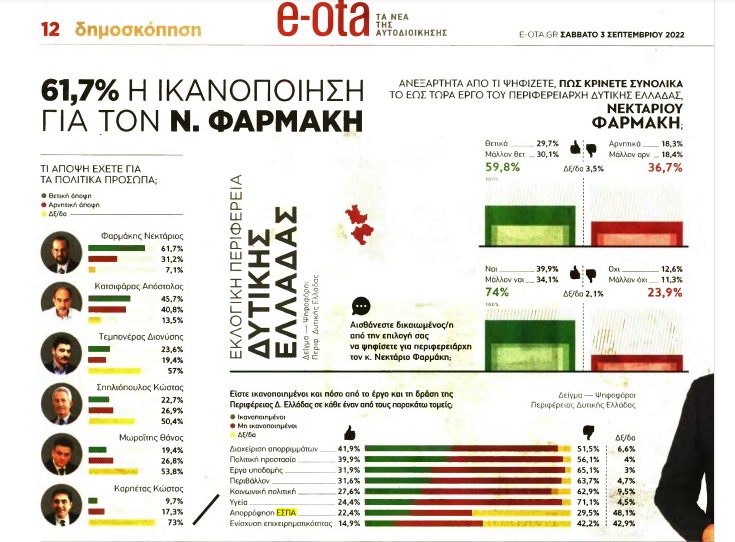 Δημοσκόπηση του «e-ota» δίνει ένα σαφές προβάδισμα υπέρ του νυν Περιφερειάρχη Δυτικής Ελλάδας, κ. Νεκτάριο Φαρμάκη ενόψει των Αυτοδιοικητικών Εκλογών που θα λάβουν χώρα τον Οκτώβριο του 2023.