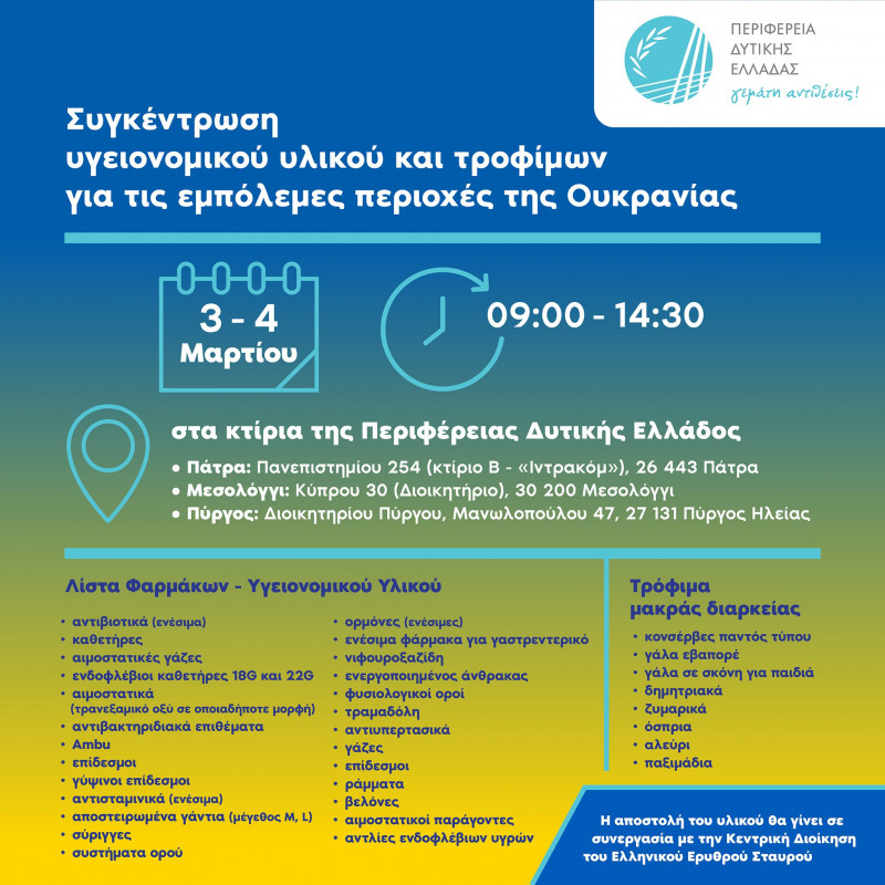 Φορείς, εκπρόσωποι τοπικών επιχειρήσεων και πολίτες επιθυμούν να βοηθήσουν, μπορούν να προσφέρουν φάρμακα, υγειονομικό υλικό και τρόφιμα, την Πέμπτη 3 και την Παρασκευή 4 Μαρτίου 2022, κατά τις ώρες 09:00 – 14:30 στα κτίρια της Περιφέρειας Δυτικής Ελλάδος: