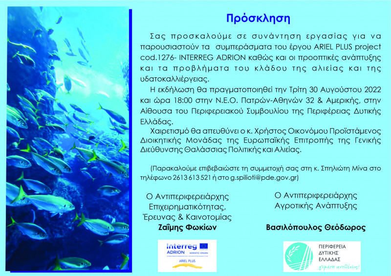 Το έργο ARIEL PLUS cod. 1276 αποτελεί διεύρυνση των αποτελεσμάτων του ευρωπαϊκού προγράμματος Interreg V-B Adriatic- Ionian Programme – ADRION 2014 -2020, ARIEL cod. 278. Στο έργο συμμετέχουν 6 εταίροι στους οποίους περιλαμβάνονται δημόσιοι οργανισμοί και ερευνητικοί /επιστημονικοί οργανισμοί από την Ελλάδα, την Ιταλία, τη Κροατία και το Μαυροβούνιο. ΣυντονιστήςείναιτοCNR –IRBIM Institute of Biological Resources &Marine Biotechnologies- National Research Council απότηνΙταλία.Από πλευράς Ελλάδας, συμμετείχε η Περιφέρεια Δυτικής Ελλάδας.