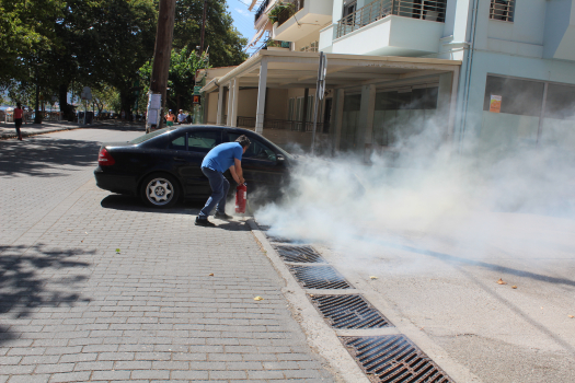 Εν τω μεταξύ στην άκρη του δρόμου πάνω στο φρεάτιο ήταν σταθμευμένο ένα αυτοκίνητο που κινδύνευσε προσωρινά. Ιδιοκτήτες παρακείμενων καταστημάτων έσβησαν την φωτιά με πυροσβεστήρα στο σημείο που βρισκόταν το όχημα αφού αρχικά θεώρησαν ότι αυτή προέρχεται από αυτό.