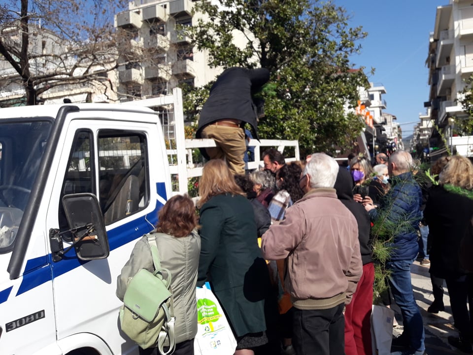 Προ ημερών είχε γίνει γνωστή η συγκεκριμένη ενέργεια, ανήμερα της Παγκόσμιας Ημέρας, όμως ο κόσμος δε γνώριζε την ακριβή ώρα. Παρ’ όλα αυτά από τις 10 περίμεναν υπομονετικά άνθρωποι όλων των ηλικιών, ενώ λίγο μετά τις 10:20 που έφτασε το αγροτικό κινήθηκαν όλοι επάνω για να πάρει ο καθένας ένα ή και δύο δενδρύλλια.