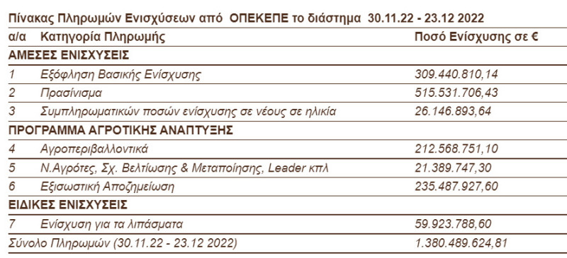 Συνολικά πληρώθηκαν 1,4 δις ευρώ σε πάνω από 640.000 αγρότες από 30.11.2022 έως 23.12.2022 – Αναλυτικά τα ποσά σε όλες τις πληρωμές.