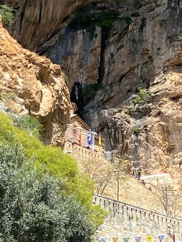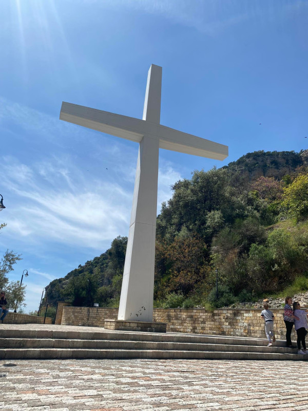 Στο μέσο της διαδρομής, από το νέο κτήριο ως το εκκλησάκι, είναι τοποθετημένος ένας Σταυρός που προκαλεί δέος σε όλους τους επισκέπτες. Το ύψος του φτάνει τα 16μ. Δημιουργήθηκε όταν ένα τμήμα του βράχου κόπηκε και στην θέση του κατασκευάστηκε η βάση του Σταύρου.