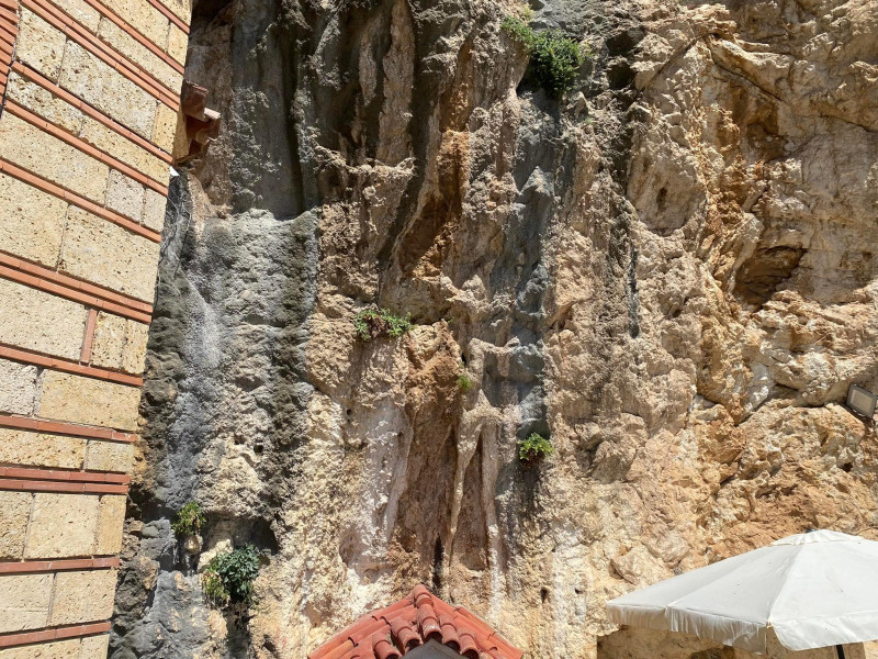 Η εκσκαφή είχε βάθος τέσσερα μέτρα. Ο μεγάλος Σταύρος, που διακρίνεται από μακριά, προϊδεάζει τον προσκυνητή αλλά και τον επισκέπτη για το μεγάλο συναπάντημα της ιστορίας μας με τη θρησκεία μας στην κάθετη πλαγιά του βουνού, ενώ του δίνει δύναμη για να συνεχίσει την πορεία του προς τον ναό.