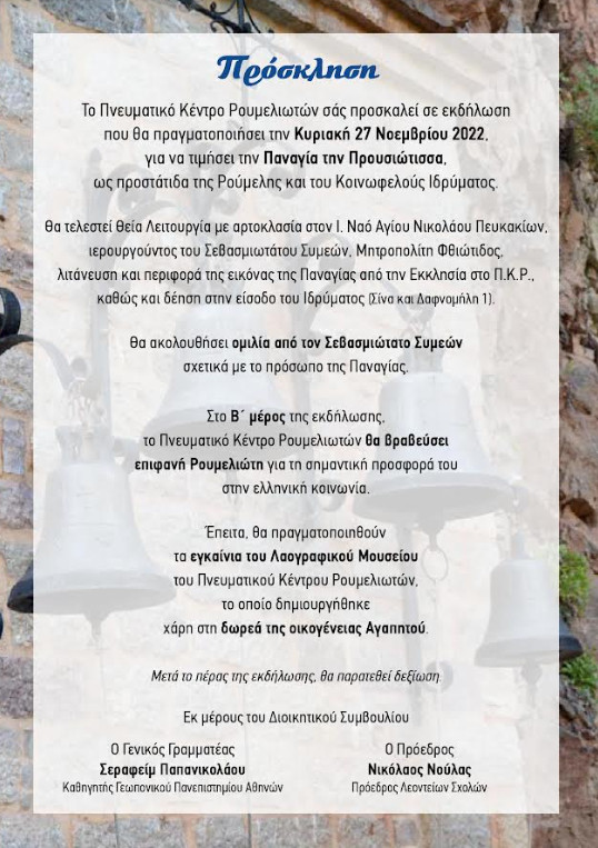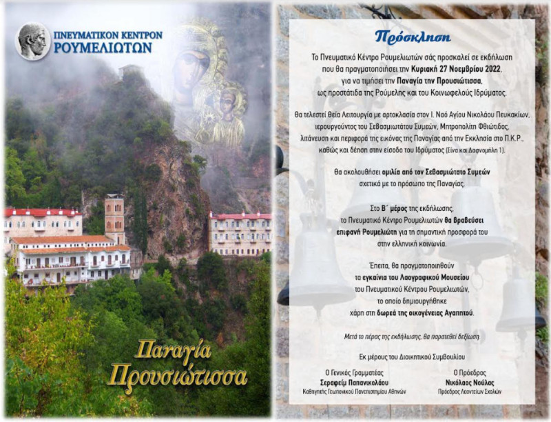 Το Πνευματικό Κέντρο Ρουμελιωτών σας προσκαλεί σε εκδήλωση που θα πραγματοποιηθεί την Κυριακή, 27 Νοεμβρίου 2022 για να τιμήσει την Παναγία την Προυσιώτισσα, ως προστάτιδα της Ρούμελης και του Κοινωφελούς Ιδρύματος.