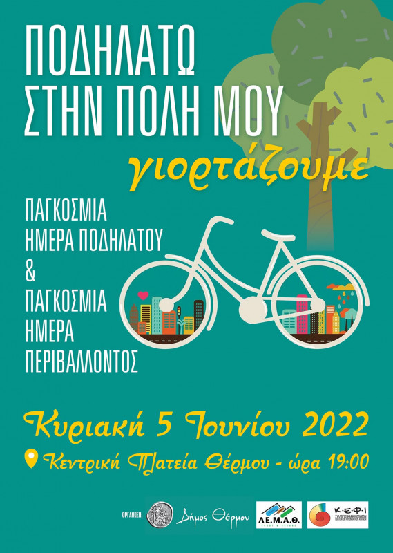 Στο πλαίσιο του Εορτασμού της Παγκόσμιας Ημέρας Περιβάλλοντος συνδιοργανώνεται από τον Δήμο Θέρμου, τη Λέσχη Μεικτού Αθλητισμού Θέρμου (ΛΕ.Μ.Α.Θ.) και τον Σύλλογο Καρκινοπαθών Εθελοντών Φίλων Ιατρών Αθηνών, η εκδήλωση «Ποδηλατώ στην πόλη μου» η οποία θα πραγματοποιηθεί την Κυριακή 5 Ιουνίου 2022 και ώρα 19:00 στην Κεντρική Πλατεία του Θέρμου.