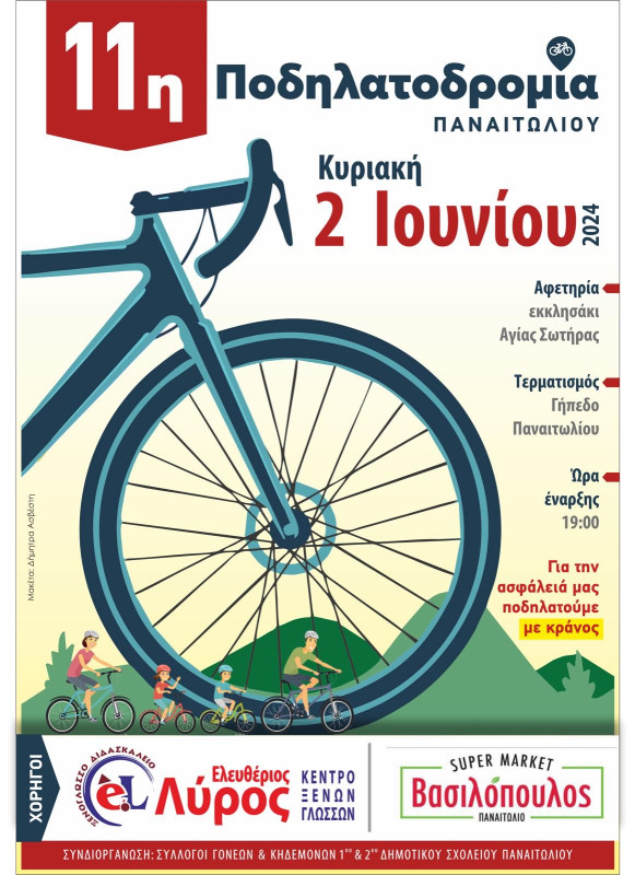 «Για ενδέκατη χρονιά, οι Σύλλογοι Γονέων και κηδεμόνων του 1ου & 2ου Δημοτικού Σχολείου Παναιτωλίου, με την υποστήριξη των μεγάλων χορηγών «Φροντιστήριο ξένων γλωσσών, Ελ. Λύρος & Super Market ΒΑΣΙΛΟΠΟΥΛΟΣ – Παναιτωλιο», διοργανώνουν Ποδηλατοδρομία για όλα τα παιδιά προσχολικής και σχολικής ηλικίας αλλά και για τους μεγάλους!