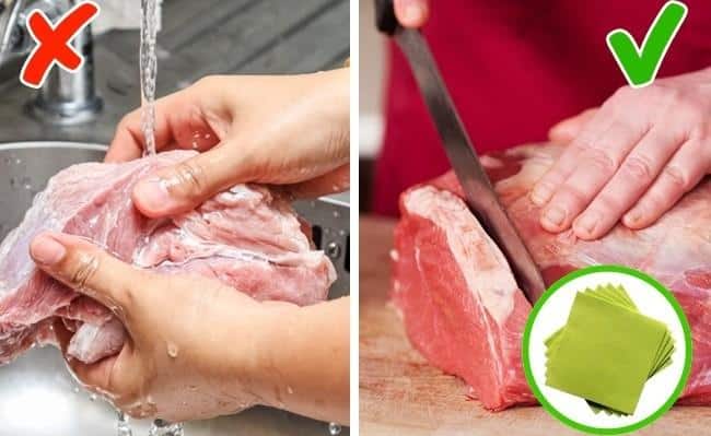 - Κρέας: Όπως και το κοτόπουλο, δεν πρέπει να πλένετε το νωπό κρέας (βοδινό, χοιρινό, μοσχάρι, αρνί), επειδή το πλύσιμο βοηθά τα βακτηρίδια να εξαπλωθούν στον νεροχύτη της κουζίνας και στα χέρια σας. Μπορείτε να απαλλαγείτε από τα βακτήρια μαγειρεύοντας σε επαρκώς υψηλή θερμοκρασία. Συμβουλή: Πριν από το μαγείρεμα, χρησιμοποιήστε χαρτοπετσέτες για να αφαιρέσετε τους χυμούς του κρέατος από την επιφάνεια του. Στη συνέχεια, χρησιμοποιήστε σαπούνι και ζεστό νερό για να πλύνετε τα χέρια σας.