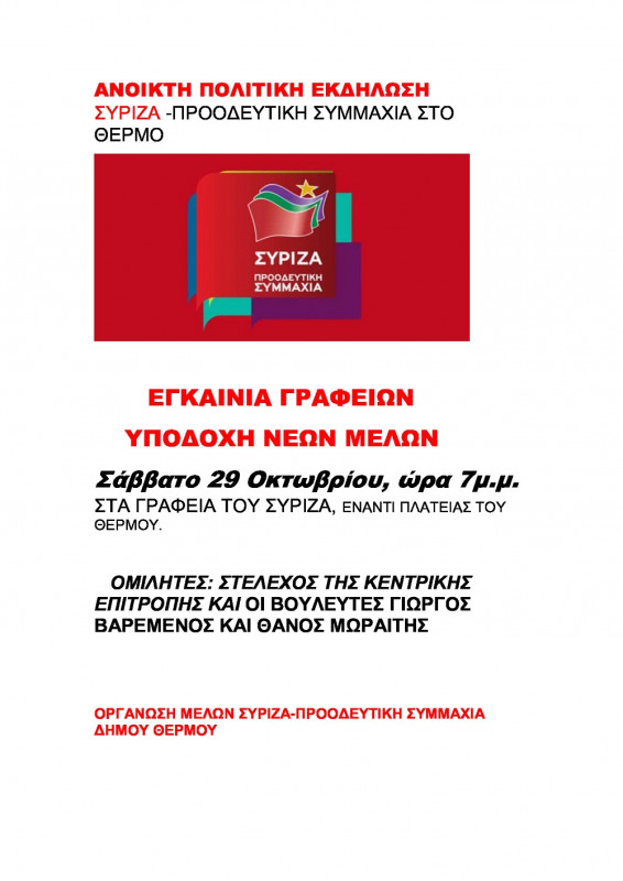 Ανοιχτή πολιτική εκδήλωση διοργανώνει η Οργάνωση Μελών ΣΥ.ΡΙΖ.Α.-Π.Σ. Δήμου Θέρμου για τα εγκαίνια των νέων γραφείων (έναντι της Πλατείας) και την υποδοχή των νέων μελών, το Σάββατο 29 Οκτωβρίου στις 7μ.μ.