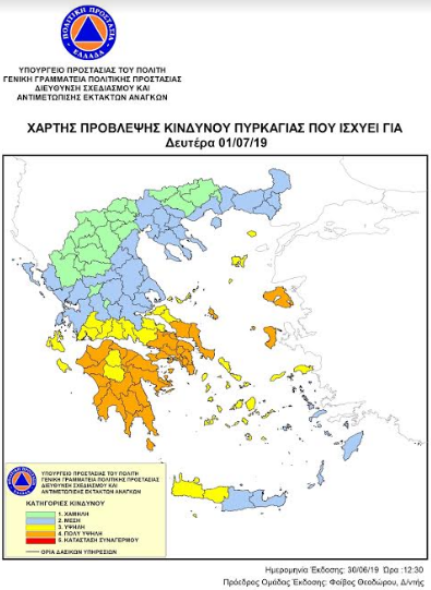 Σύμφωνα με πρόβλεψη της Γενικής Γραμματείας Πολιτικής Προστασίας, η Περιφέρεια Δυτικής Ελλάδος, την Δευτέρα 1 Ιουλίου 2019 θα βρίσκεται στην κατηγορία κινδύνου 4 (πολύ υψηλή), όπως φαίνεται στον επισυναπτόμενο ημερήσιο Χάρτη Πρόβλεψης Κινδύνου Πυρκαγιάς.