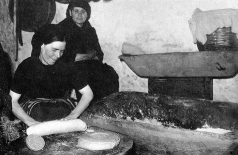 Και επειδή το σταρένιο αλεύρι ήταν ανύπαρκτο τότε, το ψωμί φτιαχνόταν από οτιδήποτε ήταν διαθέσιμο: καλαμπόκι, κριθάρι, πατάτα, χαρούπια, βελανίδια αλεσμένα.
