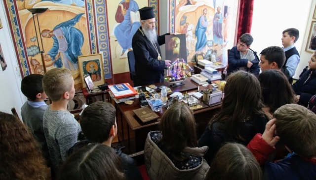 Ὁ Σεβασμιώτατος μίλησε στά παιδιά κατάλληλα καί τά ξενάγησε στό γραφεῖο του.