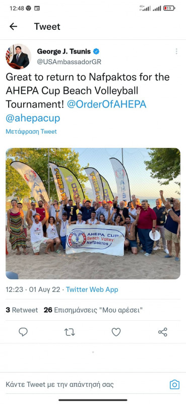 Παρουσία του Αμερικανού Πρέσβη στην Ελλάδα κ Τζορτζ Τσούνη ολοκληρώθηκε την Κυριακή, 31 Ιουλίου το Τουρνουά Μικτών Ομάδων «AHEPA CUP 2022» Beach Volleyball Tournament στη Ναύπακτο.
