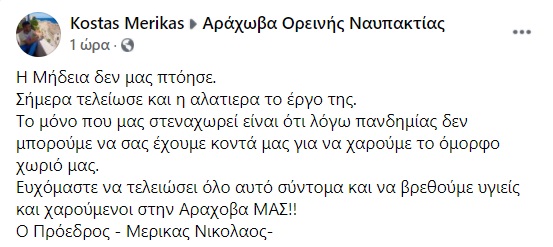 Με μια μικρή ανακοίνωση μέσα από τα social media του γιου του ο Πρόεδρος της Αράχωβας Ναυπακτίας Νίκος Μερίκας αναφέρθηκε στην προσπάθεια των συνεργείων του Δήμου Ναυπακτίας για να ανοίξουν οι δρόμοι στην Ορεινή Ναυπακτία αλλά και στο δικό του χωριό την Αράχωβα.