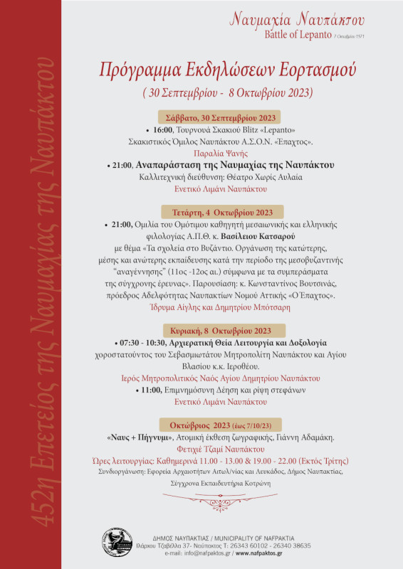 Το Πρόγραμμα των Εκδηλώσεων της 452ης Επετείου της Ναυμαχίας της Ναυπάκτου