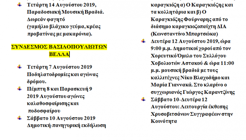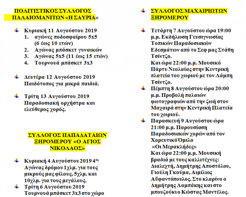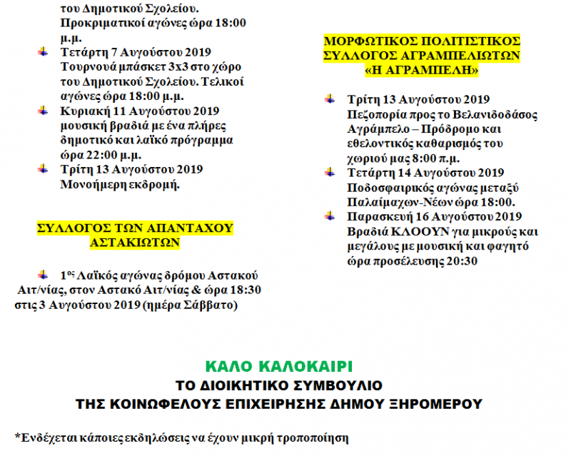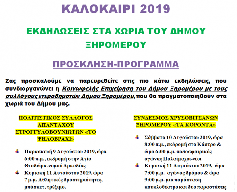 Σας προσκαλούμε να παρευρεθείτε στις πιο κάτω εκδηλώσεις, που συνδιοργανώνει η Κοινωφελής Επιχείρηση του Δήμου Ξηρομέρου με τους συλλόγους ετεροδημοτών, που θα πραγματοποιηθούν στα χωριά του Δήμου μας.
