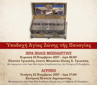 Η Ιερά Μητρόπολις Αιτωλίας και Ακαρνανίας, όπως έχει ήδη ανακοινωθεί, θα έχει την ιδιαιτέρα τιμή και ευλογία να υποδεχθεί, στην Ιερά Πόλη του Μεσολογγίου και στην πόλη του Αγρινίου, την πάνσεπτη και χαριτόβρυτη Τιμία Ζώνη της Υπεραγίας Θεοτόκου, από την Ιερά Μεγίστη Μονή Βατοπαιδίου του Αγίου Όρους, από 19 έως 25 Νοεμβρίου.
