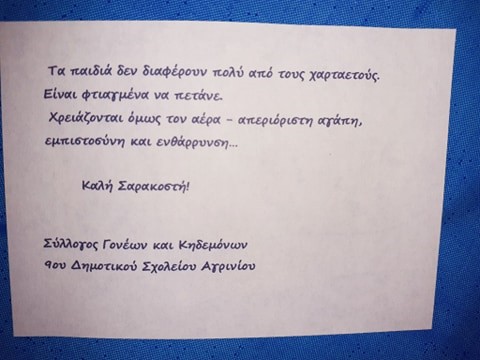 Έχοντας λάβει όλα τα απαραίτητα μέτρα προστασίας, δώρισε με μεγάλη χαρά στα παιδιά του 9ου Δημοτικού Σχολείου Αγρινίου, στα παιδιά του 9ου Νηπιαγωγείου Αγρινίου και στα παιδιά του 1ου Ειδικού Δημοτικού Σχολείου Αγρινίου πολύχρωμους χαρταετούς!
