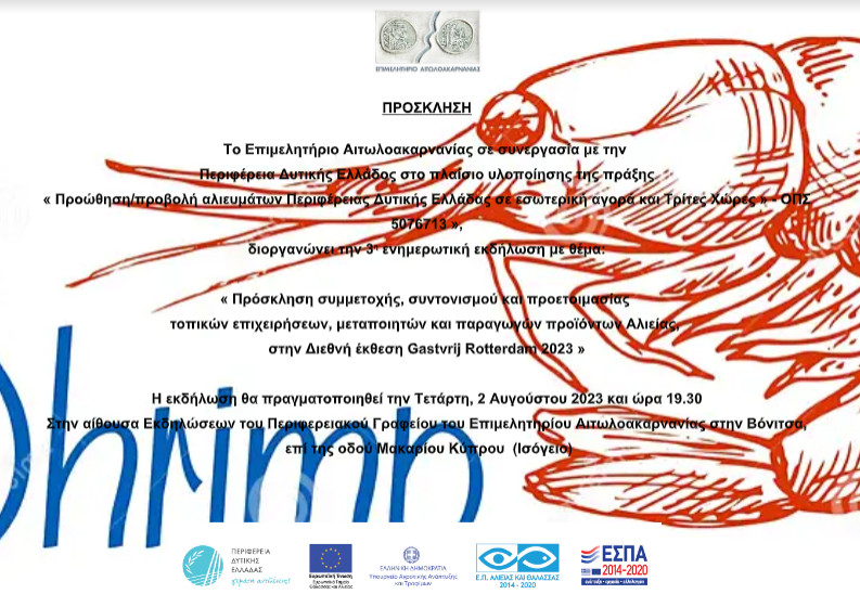 Το Επιμελητήριο Αιτωλοακαρνανίας σε συνεργασία με την Περιφέρεια Δυτικής Ελλάδος στο πλαίσιο υλοποίησης της πράξης «Προώθηση/προβολή αλιευμάτων Περιφέρειας Δυτικής Ελλάδας σε εσωτερική αγορά και Τρίτες Χώρες» – ΟΠΣ 5076713», διοργανώνει την 3η ενημερωτική εκδήλωση με θέμα: