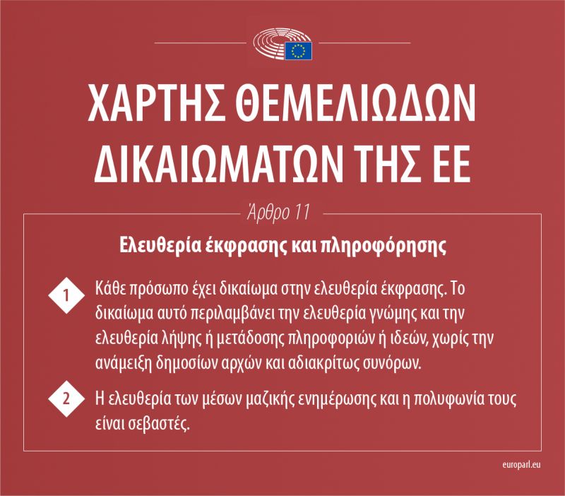 Η ελευθερία της έκφρασης, η ελευθερία των μέσων ενημέρωσης και ο πλουραλισμός κατοχυρώνονται στον Χάρτη των Θεμελιωδών Δικαιωμάτων της ΕΕ, καθώς και στην Ευρωπαϊκή Σύμβαση για τα Ανθρώπινα Δικαιώματα.