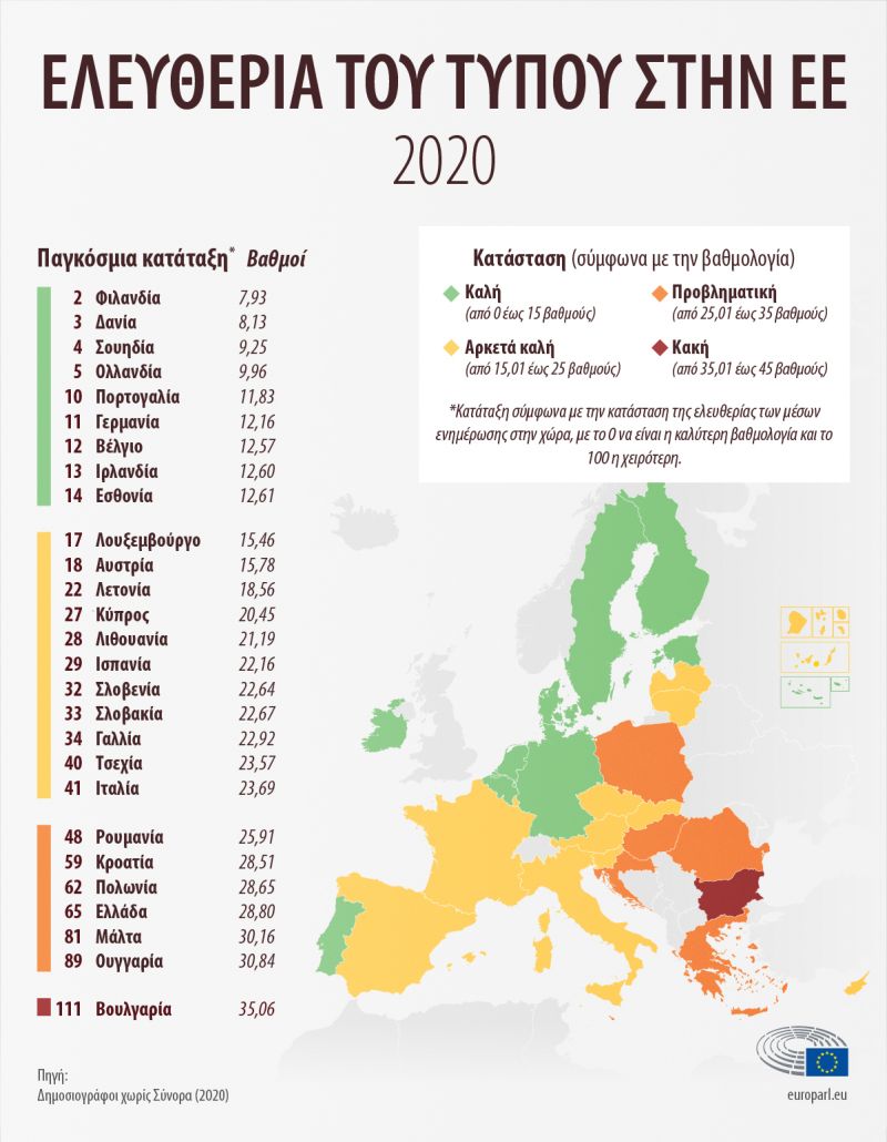 Σύμφωνα με τον δείκτη του 2020, η Ευρώπη παραμένει η ήπειρος που διασφαλίζει περισσότερο την ελευθερία του Τύπου. Οι χώρες της ΕΕ χαρακτηρίζονται, σύμφωνα με την κατάταξη, ως «καλές» ή «αρκετά καλές». Η Φινλανδία, η Δανία, η Σουηδία και η Ολλανδία συνεχίζουν να καταγράφουν τις καλύτερες βαθμολογίες.