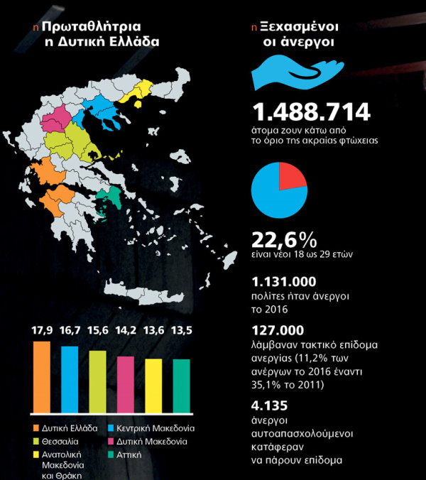 Τα δεδομένα αποδεικνύουν ότι δεν τους συναντά ο πρωθυπουργός στη μεγάλη έξοδο του Πάσχα, ενώ είναι βέβαιο ότι τους… ξέχασε όταν μοίραζε τον χριστουγεννιάτικο μποναμά σε 1,6 εκατομμύρια συνταξιούχους. Νέοι και άνεργοι δεν πήραν ούτε ένα ευρώ παρά το γεγονός ότι το 2016 άνεργοι ήταν 1.131.000 πολίτες και από αυτούς μόλις ένας στους δέκα (127.000) έπαιρνε τακτικό επίδομα ανεργίας, ενώ χάρη στον «κόφτη» της γραφειοκρατίας οι αυτοαπασχολούμενοι άνεργοι που πήραν επίδομα ήταν μόλις 4.135 άτομα…