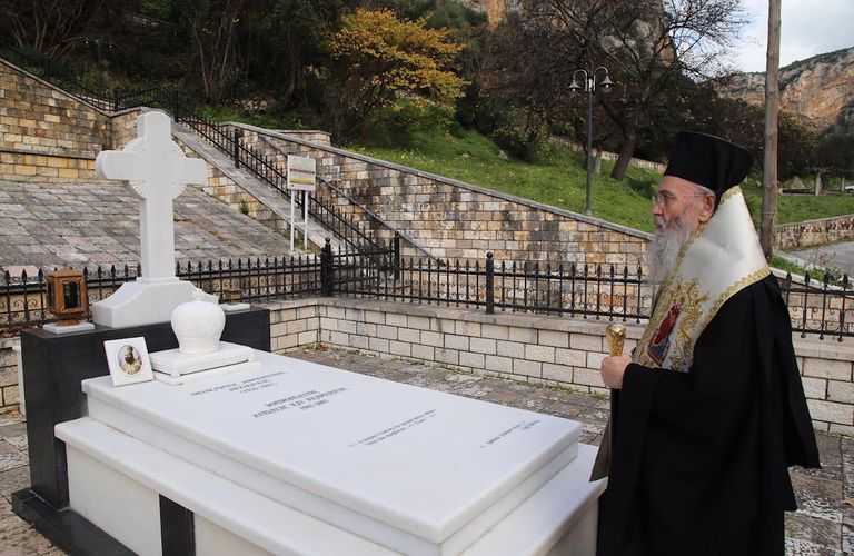 Ἐπιστρέφοντας στήν Ναύπακτο, μετά τό μεσημέρι, τέλεσε τρισάγιο στόν τάφο τοῦ μακαριστοῦ Μητροπολίτου Αἰτωλίας καί Ἀκαρνανίας κυροῦ Θεοκλήτου, στήν Ἱερά Μονή Ἁγίας Ἐλεούσης, ὁ ὁποῖος ὑπῆρξε Τοποτηρητής τῆς Ἱερᾶς Μητροπόλεως Ναυπάκτου καί Ἁγίου Βλασίου, καί ἀπό τόν ὁποῖον ὁ Σεβασμιώτατος Μητροπολίτης κ. Ἱερόθεος παρέλαβε τήν Ἱερά Μητρόπολη τό 1995, καί τόν βοήθησε οἰκονομικά στίς ἀρχές τῆς ποιμαντορίας του.