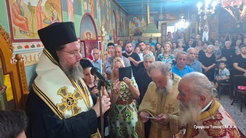Ανέφερε, ότι προετοιμαζόμαστε να εορτάσουμε την ένδοξο Κοίμηση της Υπεραγίας Θεοτόκου και την εις ουρανούς Μετάστασή της και υπογράμμισε ιδιαίτερα, ότι η Παναγία μας ανερχόμενη από της γης εις τα άνω θα παραλάβει μαζί της και θα μεταφέρει και τα δικά μας αιτήματα, τα δικά μας προβλήματα, τις παρακλήσεις μας, τους καημούς και τους πόνους μας και θα τα καταθέσει ενώπιον του θρόνου της μεγαλωσύνης του Υιού της και Θεού μας.