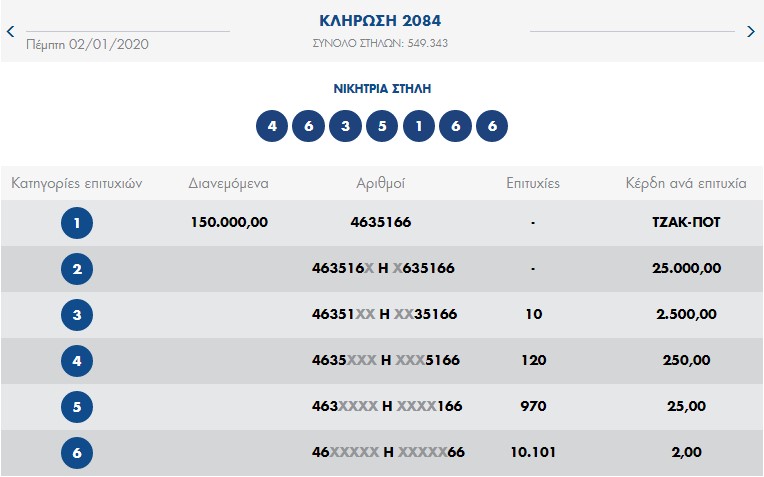 €150.000 τουλάχιστον θα μοιραστούν οι τυχεροί της 1ης κατηγορίας στην επόμενη κλήρωση της ΚΥΡΙΑΚΗΣ 5/1/2020 μετά το ΤΖΑΚ-ΠΟΤ που σημειώθηκε κατά τη σημερινή διαλογή της 2084ης κλήρωσης του ΠΡΟΤΟ.