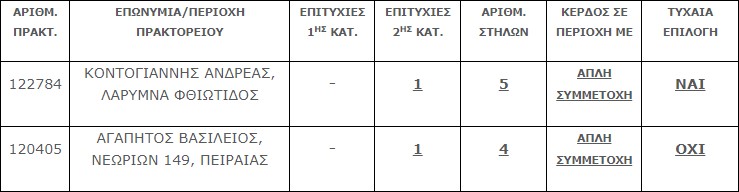 Επίσης στην δεύτερη κατηγορία (6) βρέθηκαν δύο (2) τυχερά δελτία που κερδίζει το ποσό των € 25.000,00 έκαστο.