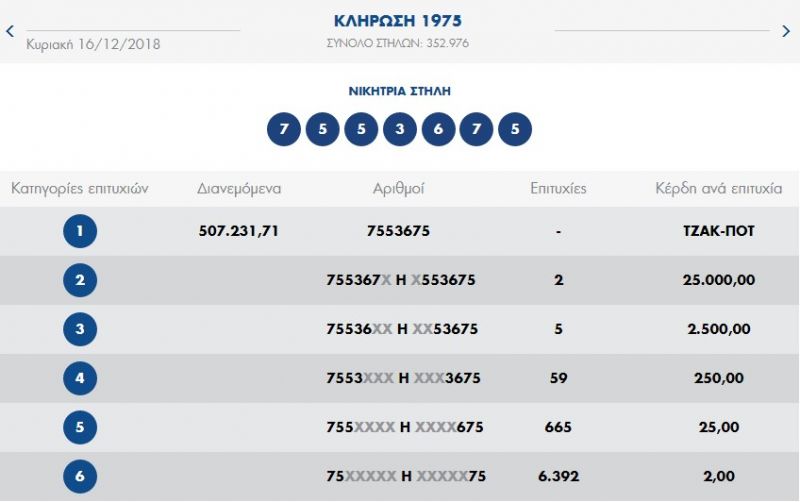 €520.000 τουλάχιστον θα μοιραστούν οι τυχεροί της 1ης κατηγορίας στην επόμενη κλήρωση της ΠΕΜΠΤΗΣ 20/12/2018 μετά το ΤΖΑΚ-ΠΟΤ που σημειώθηκε κατά τη σημερινή διαλογή της 1975ης κλήρωσης του ΠΡΟΤΟ.
