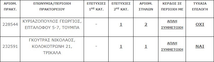 Επίσης στην δεύτερη κατηγορία (6) βρέθηκε δύο (2) τυχερά δελτία που κερδίζει το ποσό των € 25.000,00 έκαστο.