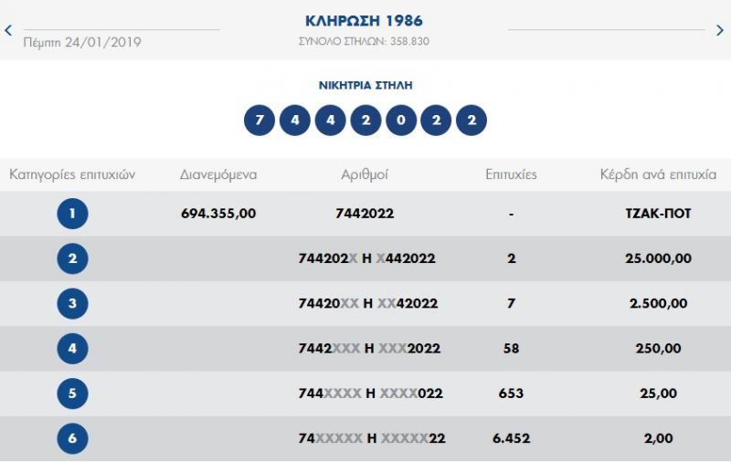 €710.000 τουλάχιστον θα μοιραστούν οι τυχεροί της 1ης κατηγορίας στην επόμενη κλήρωση της ΚΥΡΙΑΚΗΣ 27/01/2019 μετά το ΤΖΑΚ-ΠΟΤ που σημειώθηκε κατά τη σημερινή διαλογή της 1986ης κλήρωσης του ΠΡΟΤΟ.