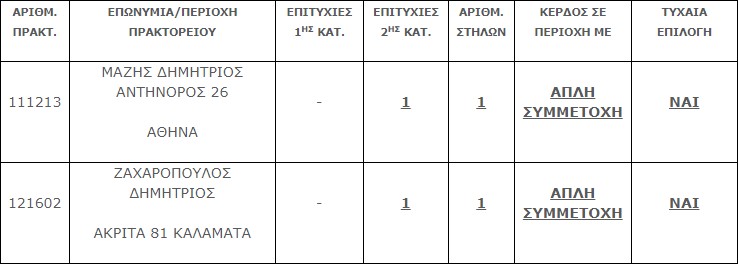 Επίσης στην δεύτερη κατηγορία (6) βρέθηκαν δύο (2) τυχερά δελτία που κερδίζει το ποσό των € 25.000,00 έκαστο.