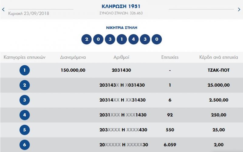 €150.000 τουλάχιστον θα μοιραστούν οι τυχεροί της 1ης κατηγορίας στην επόμενη κλήρωση της ΠΕΜΠΤΗΣ 27/09/2018 μετά το ΤΖΑΚ-ΠΟΤ που σημειώθηκε κατά τη σημερινή διαλογή της 1951ης κλήρωσης του ΠΡΟΤΟ.