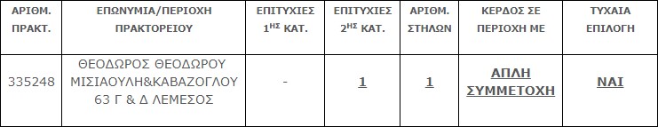 Επίσης στην δεύτερη κατηγορία (6) βρέθηκε ένα (1) τυχερό δελτίο που κερδίζει το ποσό των € 25.000,00.