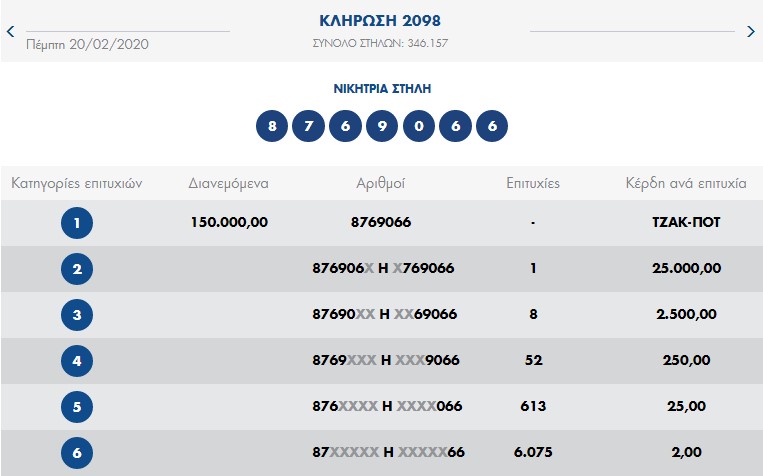 Επίσης στην δεύτερη κατηγορία (6) βρέθηκε ένα (1) τυχερό δελτίο που κερδίζει το ποσό των € 25.000,00.