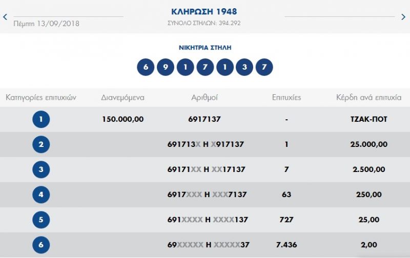 €150.000 τουλάχιστον θα μοιραστούν οι τυχεροί της 1ης κατηγορίας στην επόμενη κλήρωση της ΚΥΡΙΑΚΗΣ 16/09/2018 μετά το ΤΖΑΚ-ΠΟΤ που σημειώθηκε κατά τη σημερινή διαλογή της 1948ης κλήρωσης του ΠΡΟΤΟ.