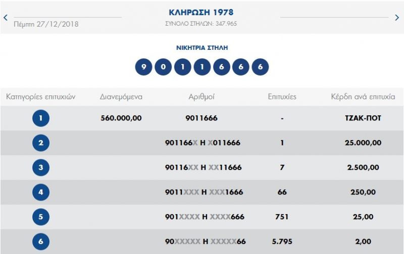 €570.000 τουλάχιστον θα μοιραστούν οι τυχεροί της 1ης κατηγορίας στην επόμενη κλήρωση της ΚΥΡΙΑΚΗΣ 30/12/2018 μετά το ΤΖΑΚ-ΠΟΤ που σημειώθηκε κατά τη σημερινή διαλογή της 1978ης κλήρωσης του ΠΡΟΤΟ.