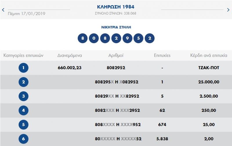 €670.000 τουλάχιστον θα μοιραστούν οι τυχεροί της 1ης κατηγορίας στην επόμενη κλήρωση της ΚΥΡΙΑΚΗΣ 20/01/2019 μετά το ΤΖΑΚ-ΠΟΤ που σημειώθηκε κατά τη σημερινή διαλογή της 1984ης κλήρωσης του ΠΡΟΤΟ.