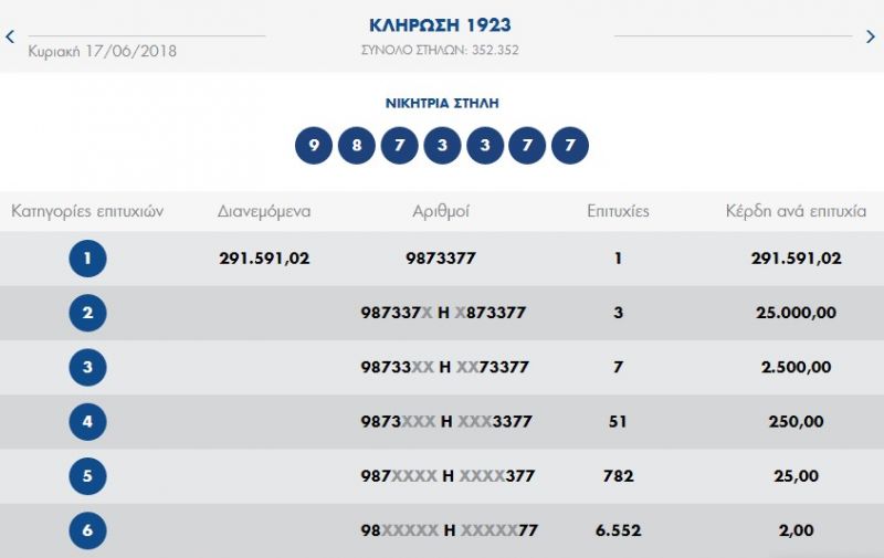 Ένα (1) τυχερό δελτίο βρέθηκε στην 1η κατηγορία (7) κατά τη σημερινή διαλογή της 1923ης κλήρωσης του ΠΡΟΤΟ που κερδίζει το ποσό των € 291.591,02. Επίσης το εν λόγω δελτίο φέρει και τρεις(3) επιτυχίες στην 2η κατηγορία (6).
